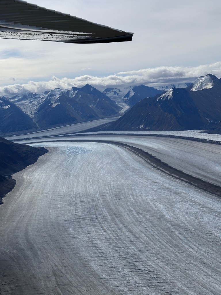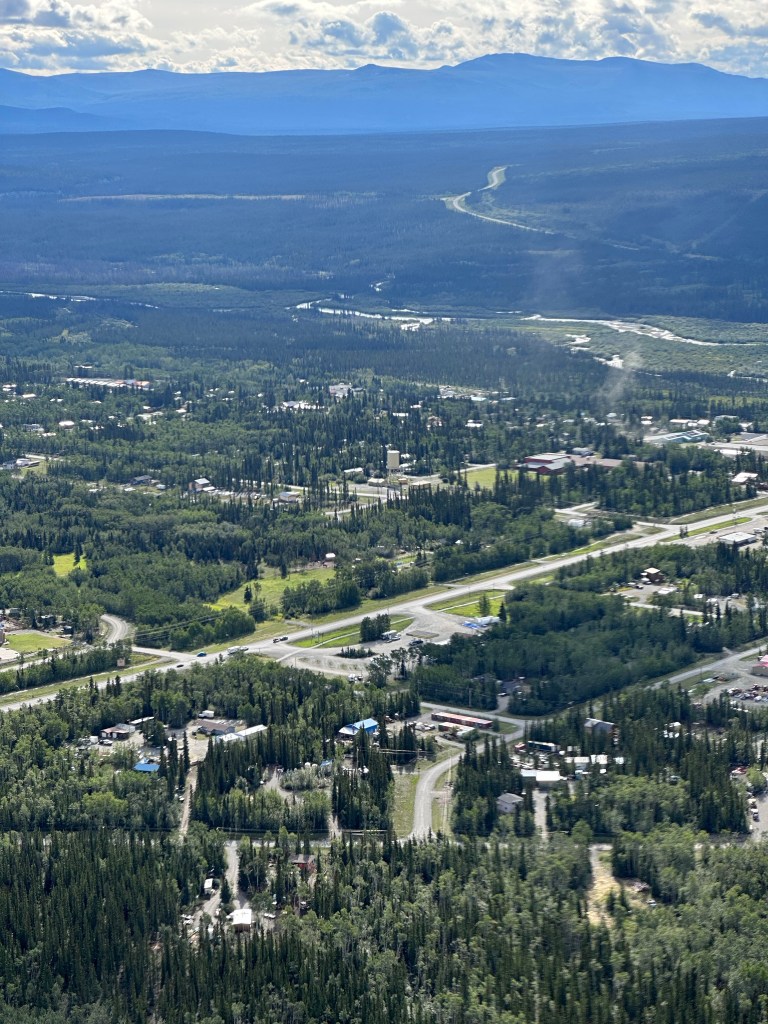 I just returned from my one hour flight in a five person Cessna 207. Remember the Bering land bridge that brought animals and people from the West? Mountains on the Alaska side of that ‚bridge‘ accumulated ice on the ocean facing side, and created a precipitation shadow beyond their Eastern slopes (reminder in the photo top left).