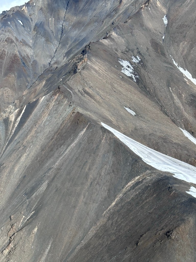 The glaciers here are special in that they surge, which few glaciers in the world do. Surges here are unpredictable, and they move the glacier at speeds up to 100m/day. Such an event happened in 1852. The glacier had earlier dammed a local river into a large lake. In one catastrophic glacier surge, that dam was broken, draining the area. The photo above is the former lake‘s bottom. We usually read something like „Five million years ago something-or-other was a lake.“ This landscape transformative event occurred ~200 years ago.