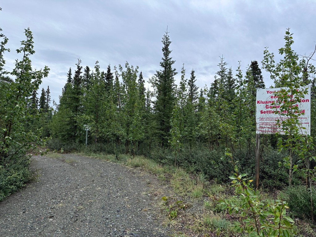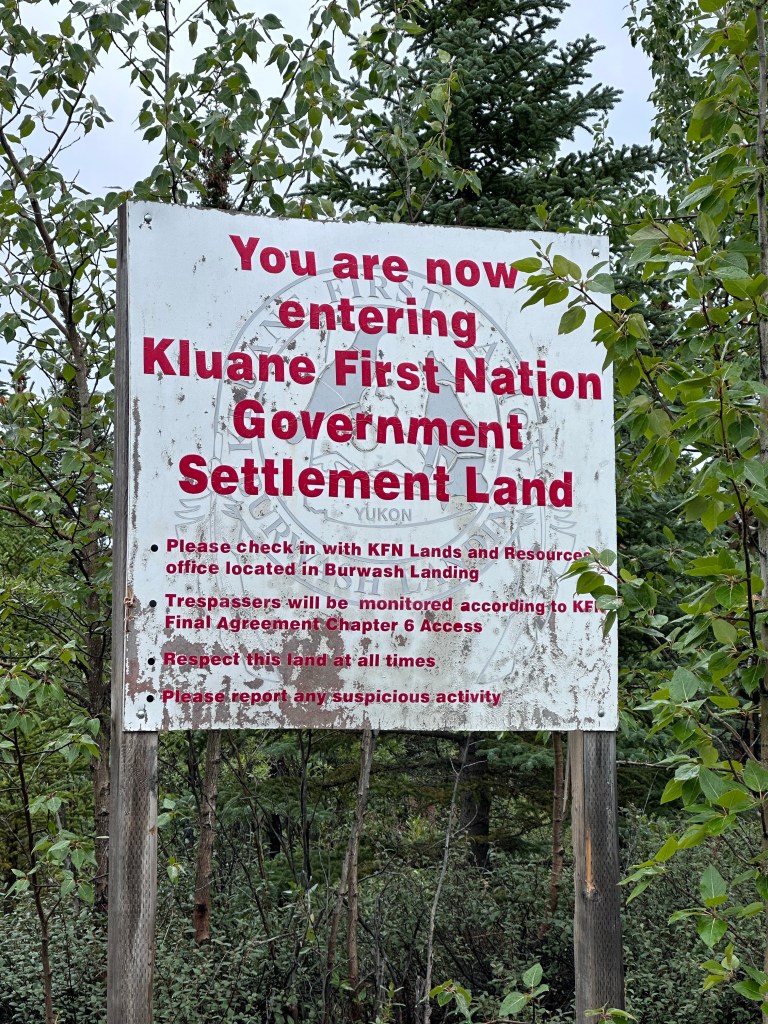 Signs about settlement land are posted whenever a road leads from the Alaska Highway into the woods. The history is this: Up to 1942 the Kluane First Nations hunted, fished, and trapped in the entire, large area. In 1942 the Alaska Highway was constructed, bringing whites, who hunted without inhibition throughout.