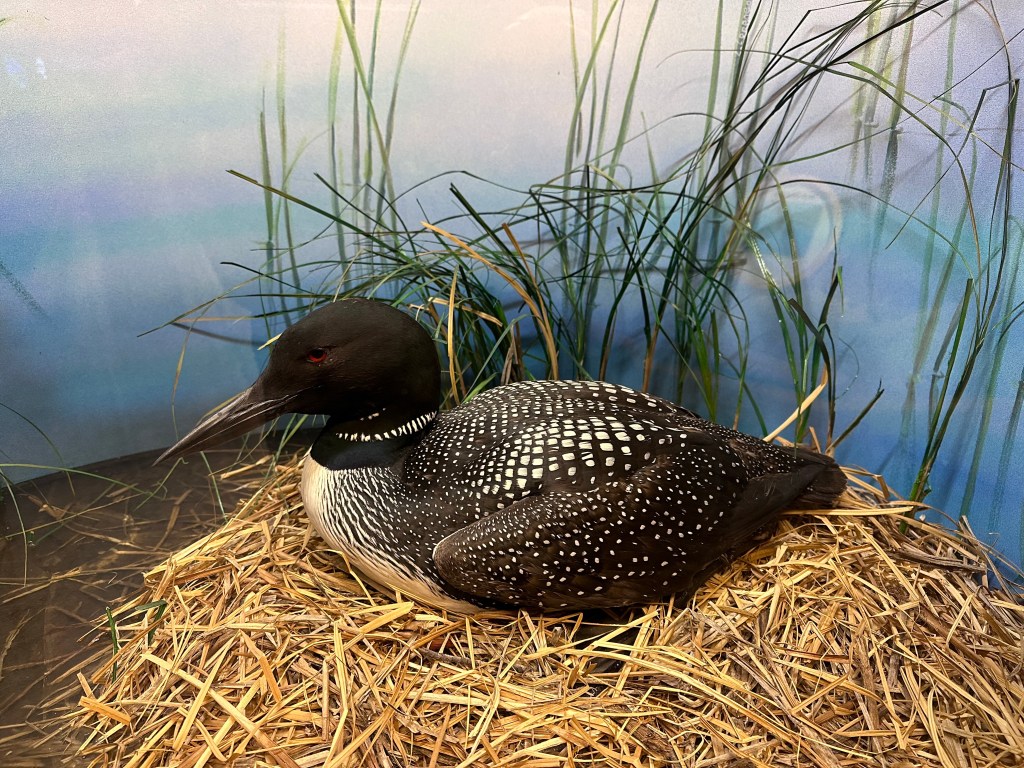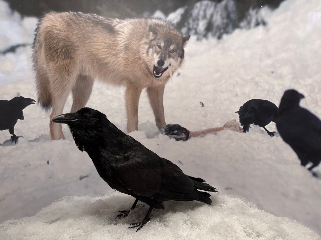 The taxidermy exhibit was beautifully arranged. I’ve shown examples from an earlier museum, so won’t repeat. I do include the lower left photo to illustrate that ravens cooperate with wolves. The birds point the predators to carcasses; the wolf opens the skin, and breaks bones, making it easier for the ravens to eat. Similarly, jays tease other animals. The loon on the lower right is included for its beauty.