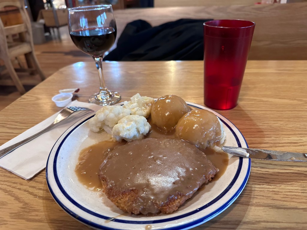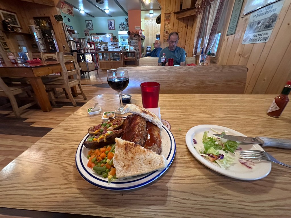 On arrival yesterday I am more tired than I realized. But also hungry. Checking in is a problem, because the motel’s card reader doesn’t work. Since there is a steady stream of putatively paying gas pump customers, the young man behind the counter is overwhelmed. The computer needs to be restarted, and he’s never done that. I’m in full gear, with luggage, anticipating my room. So, eventually I propose: