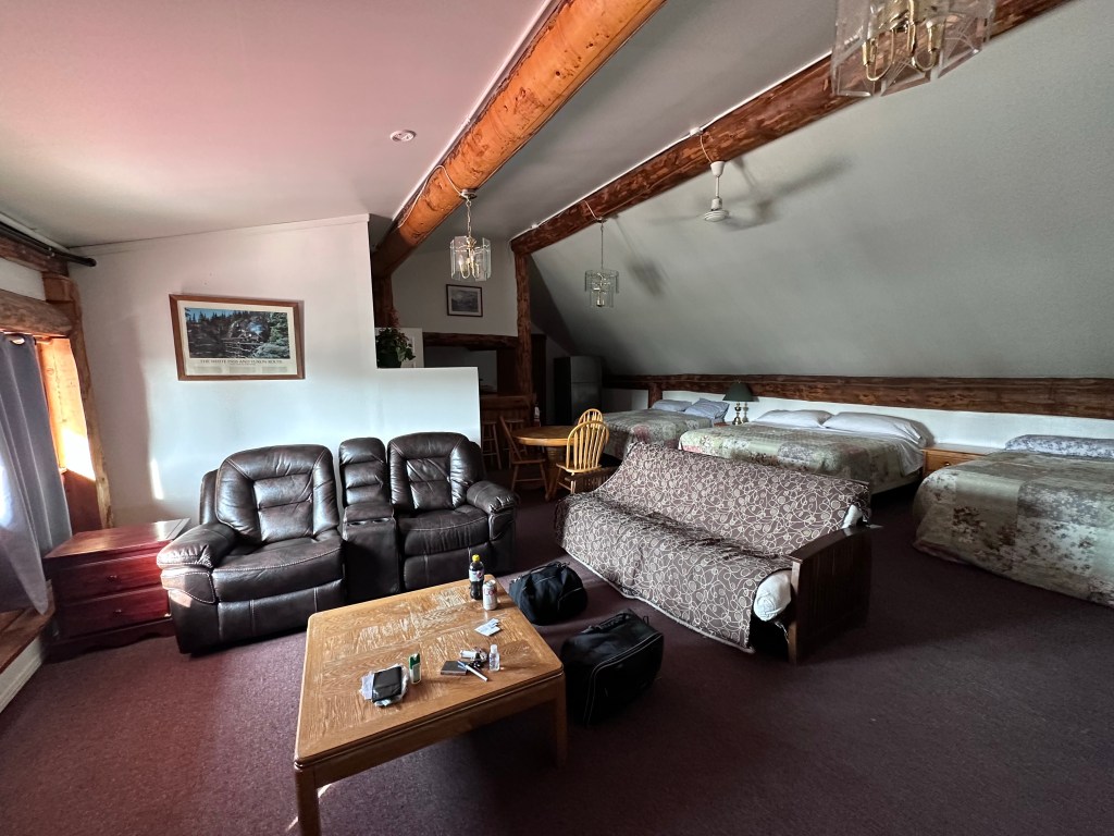 The entire upper floor on the right side of the building (photo upper left) is mine. I am room 31.Reachabe via the stairs by the side of the building. The ‘room’ contains three king sized beds, two bro rocking chairs with can holders. In the back is a kitchen and…access to room 32. We haven’t met yet.