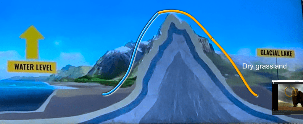 When the glaciers melt, water rises, covering the land bridge. Eastward wind from the ocean is cooled on its path up the mountains (right). On the East side, cold, but dry wind blows. This condition induces grasslands that remain mostly uncovered. Grazing animals, such as mammoths, musk ox, and horses thrive. They feed arctic lions, as well as the short-faced bear. All, in turn, are hunted by humans that crossed the previously exposed land bridge.